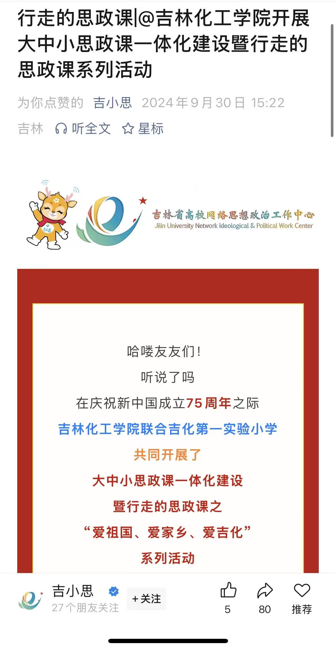 在庆祝新中国成立75周年之际,吉林化工学院联合吉化第一实验小学共同开展大中小思政课一体化建设暨行走的思政课之“爱祖国、爱家乡、爱吉化”系列活动,通过行走的思政课形式,激发学生对党、对国家、对家乡的热爱之情,弘扬中华优秀传统文化,引导学生铸牢中华民族共同体意识。