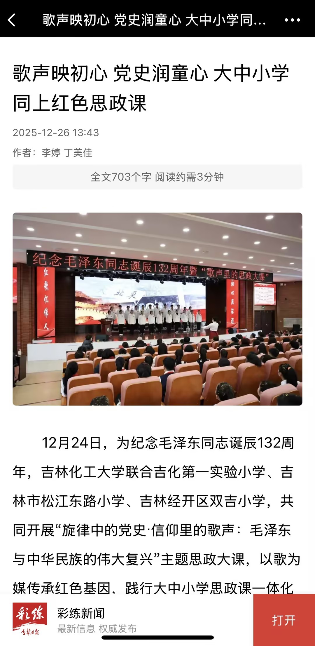 12月24日,为纪念毛泽东同志诞辰132周年,吉林化工大学联合吉化第一实验小学、吉林市松江东路小学、吉林经开区双吉小学,共同开展“旋律中的党史・信仰里的歌声:毛泽东与中华民族的伟大复兴”主题思政大课,以歌为媒传承红色基因,践行大中小学思政课一体化建设要求。