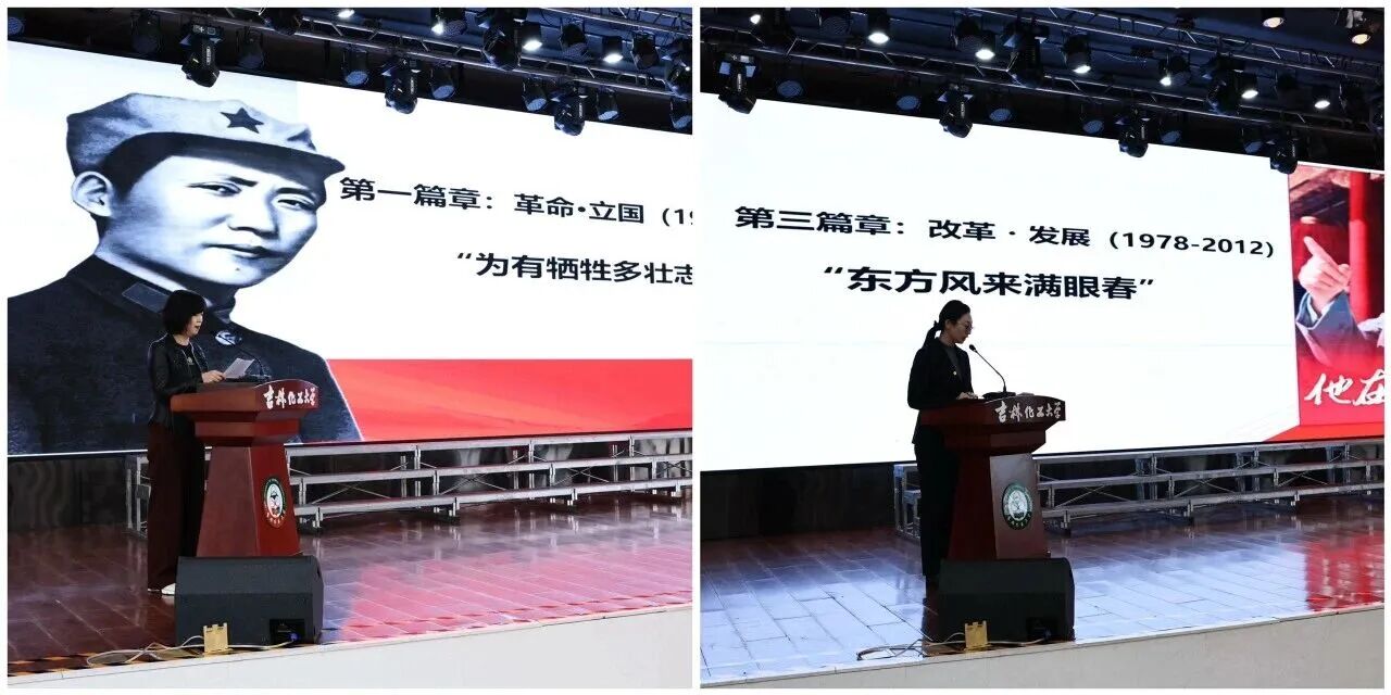 本堂思政大课由吉林化工大学马克思主义学院毛泽东思想和中国特色社会主义理论体系概论教研室李晓云教授与涂庆皓教授联袂授课,以“革命・立国”“建设・探索”“改革・发展”“奋进・复兴”为脉络展开,不同历史篇章对应不同学段学生认知特点,层层递进。四个篇章以红色经典歌曲为线索,通过“诵、唱、演、悟”一体化模式,将毛泽东等老一辈革命家的光辉事迹、党的奋斗历程与红色音乐经典深度融合。