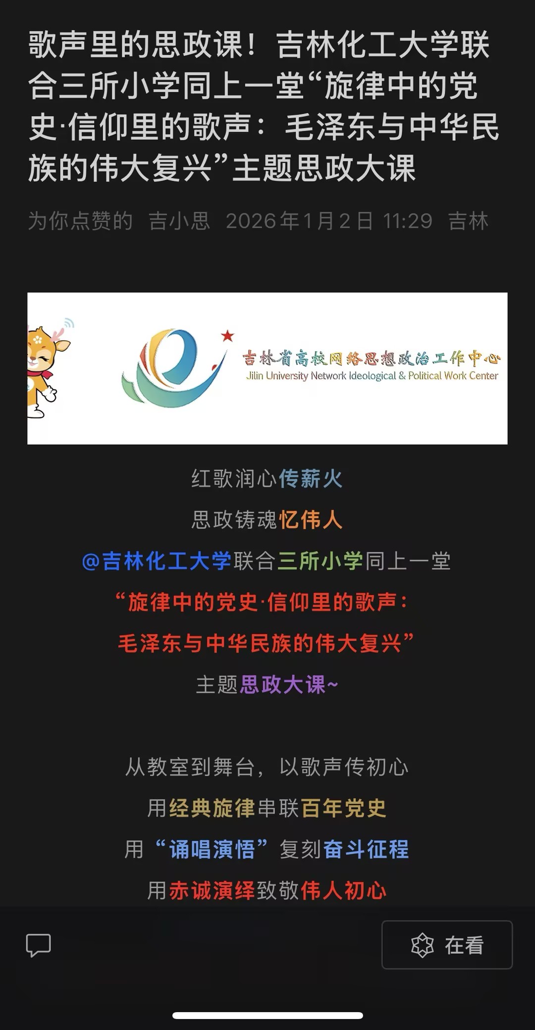 从教室到舞台,以歌声传初心。近期,为纪念毛泽东同志诞辰132周年,吉林化工大学联合吉化第一实验小学、吉林市松江东路小学、吉林经济技术开发区双吉小学同上一堂“旋律中的党史・信仰里的歌声:毛泽东与中华民族的伟大复兴”主题思政大课。本次活动以歌为媒,重温红色历史,将对伟人的崇敬、对党的热爱,从情感认同内化为价值追求,外化为青春担当,扎实推进大中小学思政课一体化建设。