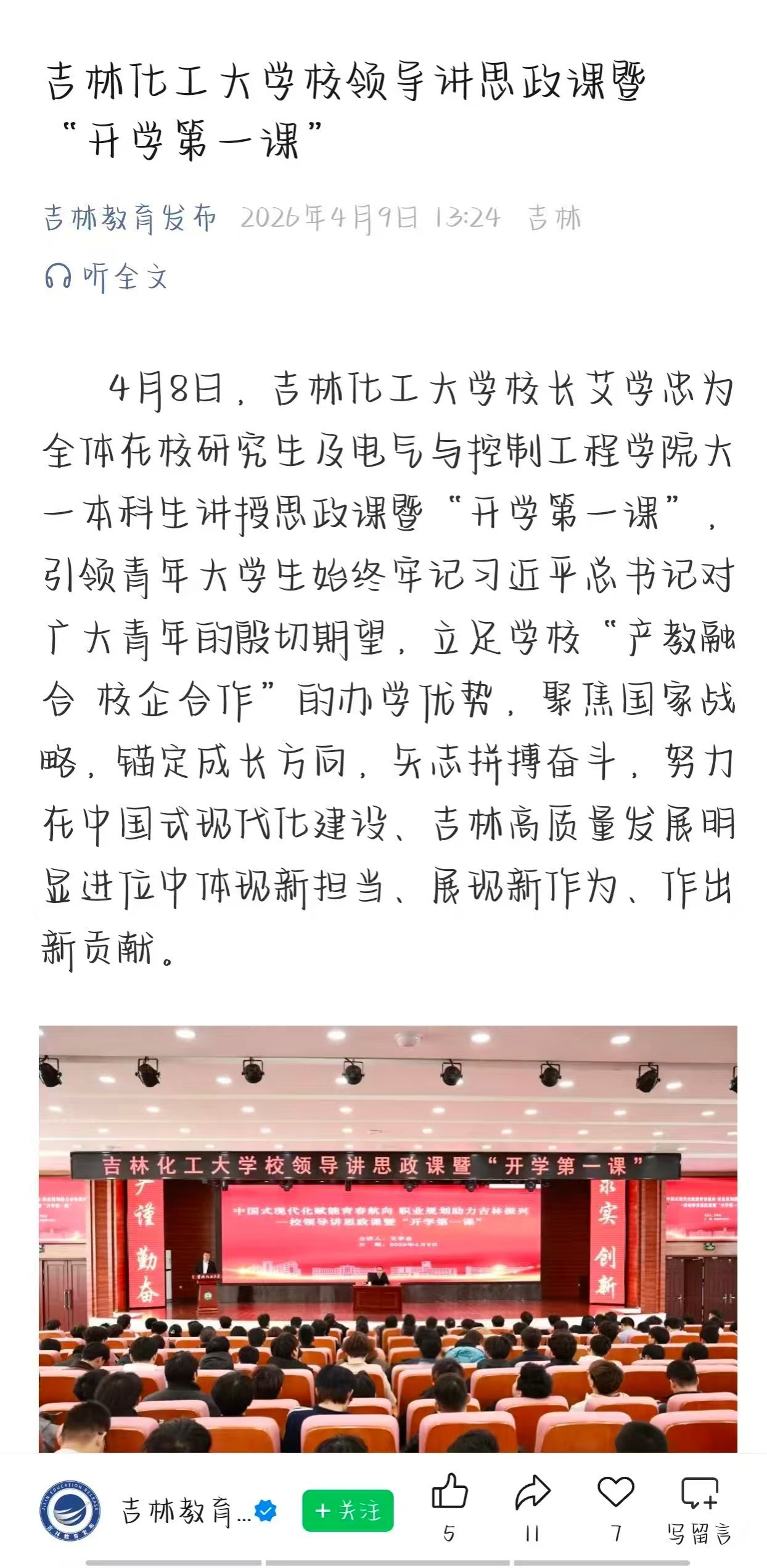 下一步,学校将推进思政课改革创新,不断丰富“开学第一课”内涵形式,推动思政教育与专业教育、工程教育深度融合,引导广大青年学生坚定理想信念、勇担时代使命,以昂扬向上的精神风貌和扎实过硬的专业能力,在服务吉林全面振兴全方位振兴、推进中国式现代化建设的生动实践中贡献青春力量。